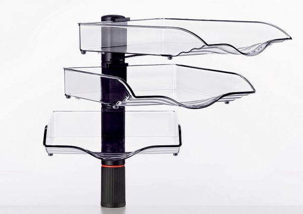 שלושה מגשי פלסטיק שקופיים ואיכותיים לאחסון נייר B4 מידות – 250 x 353 מ"מ, מתחבר לשולחן במספר דרכים. המגש מסתבב 360 מעלות, המתאם לחיבור לשולחן מגיע בצבע אפור כהה או אפור בהיר