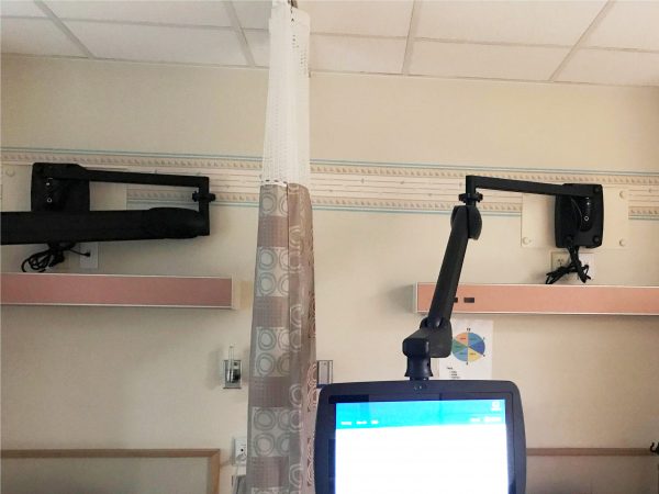 This personal bedside arm system allows the patient to easily adjust their viewing experience, away from glare and to where it’s most comfortable in their current position.